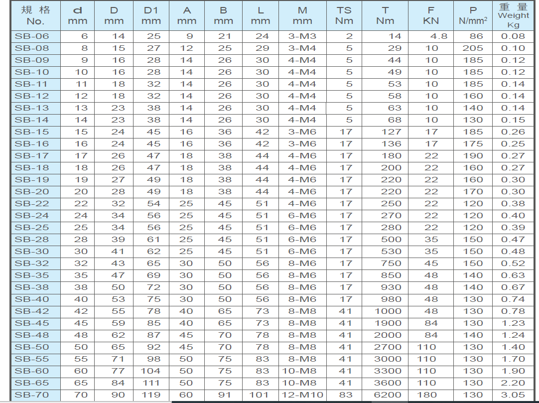 仕勛SB-18 SB-20 SB-22免鍵式軸套 軸環使用上的注意事1 所需傳動扭力的確認2 軸與孔的加工精度要求3 同心度的要求4 是否有防銹的需求以上為一般注意事項,若有特別需求,請與我們聯絡