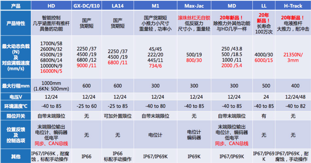 Thomson湯姆森電動推桿 執行器 電缸 有多種規格, 具體參數對比如下: